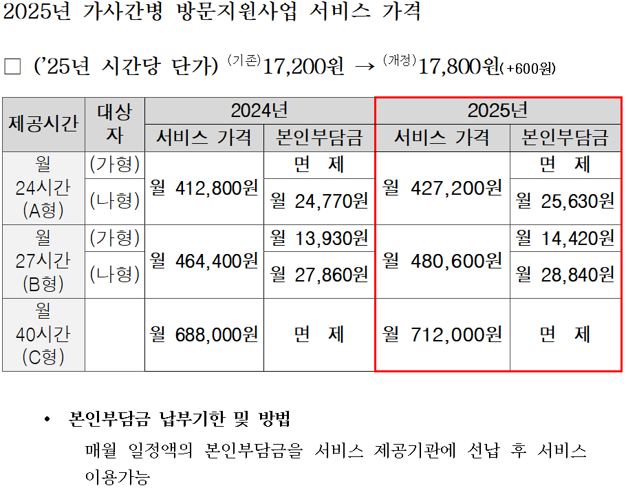 - 서비스 대상자의 소득 및 서비스 시간(일)에 따라 정부지원금을 차등 지원
